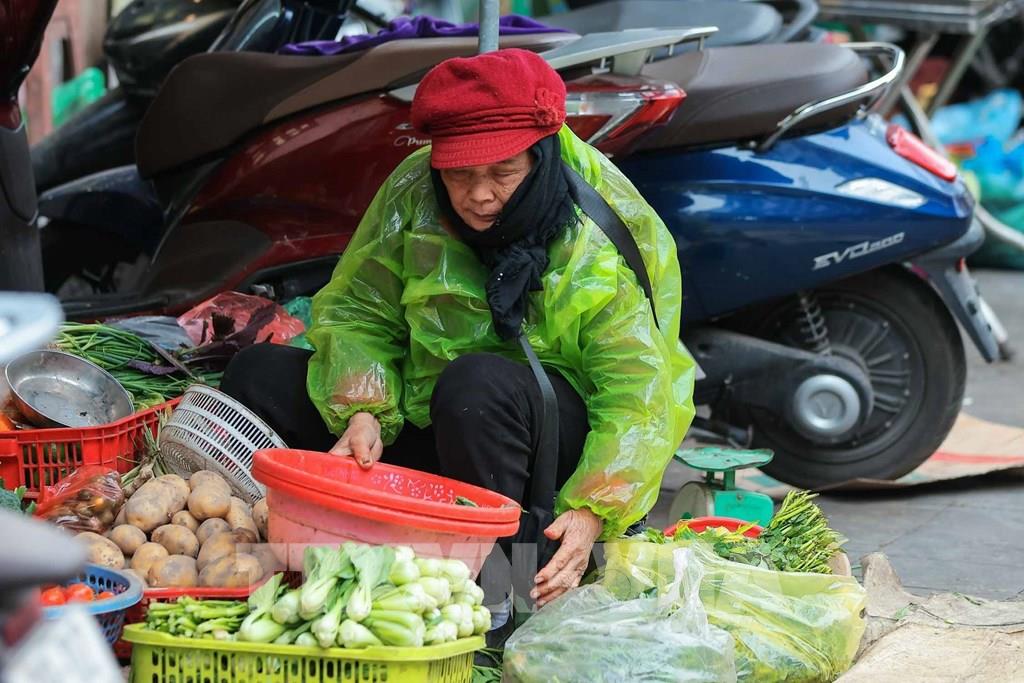 Một người bán hàng chợ Đồng Xuân phải mặc thêm áo mưa chống rét. Ảnh: Hoàng Hiếu - TTXVN