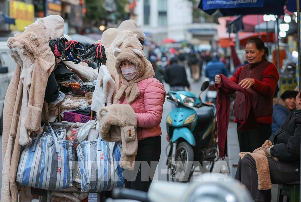 Người lao động, bán hàng trên phố che chắn kỹ chống rét. Ảnh: Hoàng Hiếu - TTXVN