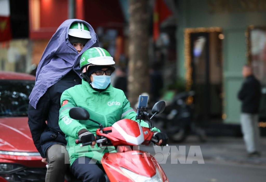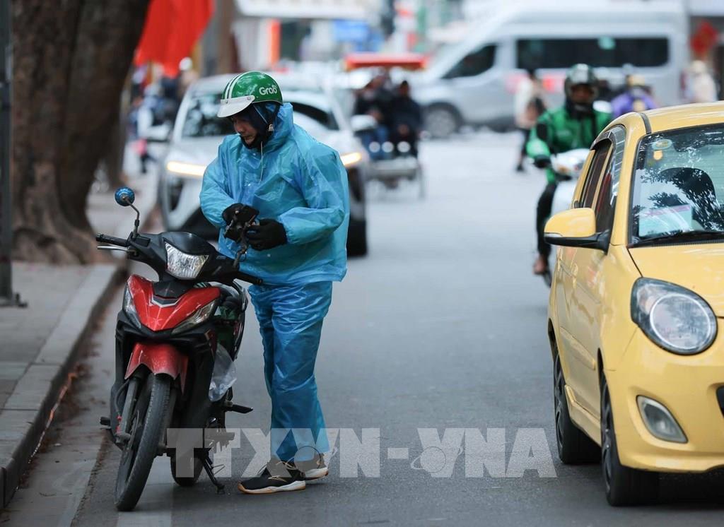 Một lái xe công nghệ phải mặc thêm áo mưa để chống rét khi nhiệt độ Hà Nội giảm rõ rệt. Ảnh: Hoàng Hiếu - TTXVN