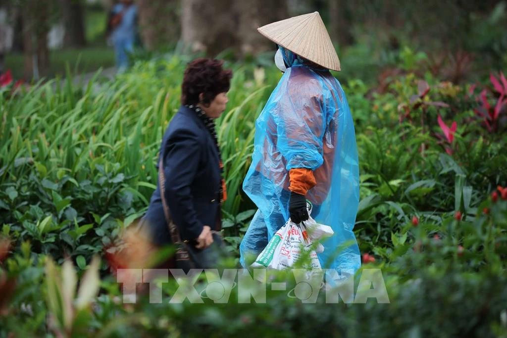 Người lao động ngoài trời ngoài mặc áo ấm còn trang bị thêm áo mưa để che chắn trong đợt rét khắc nghiệt. Ảnh: Hoàng Hiếu - TTXVN