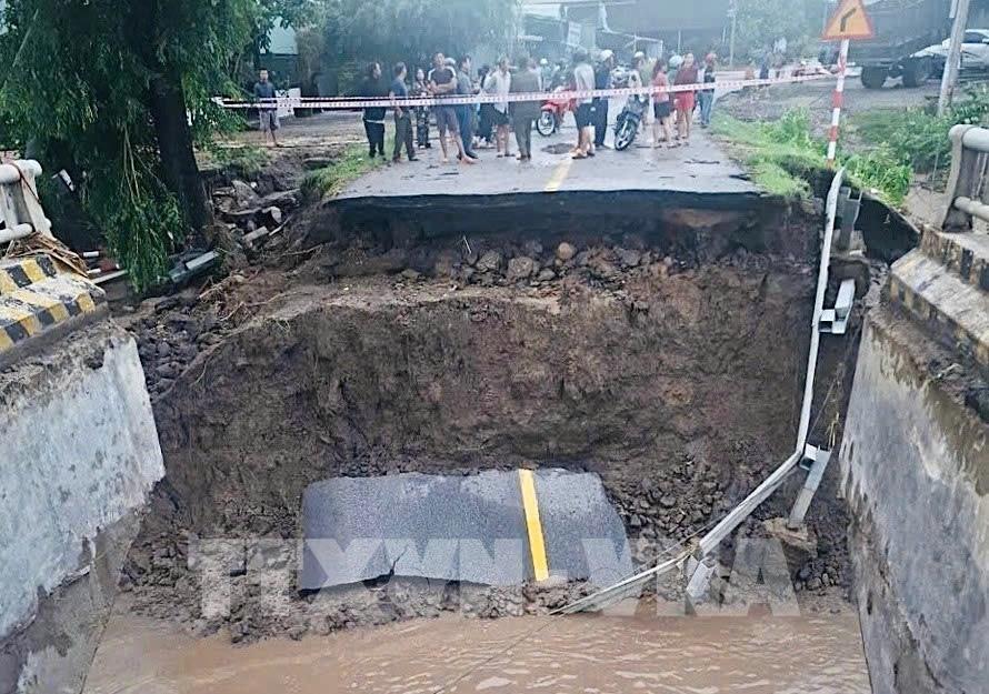 Mưa lớn làm sạt lở 20m đường dẫn vào cầu Kliếc (đoạn qua xã Pờ Tó, tỉnh Gia Lai), chia cắt giao thông đoạn xã Pờ Tó và xã Chơ Long đi Quốc lộ 19. Ảnh: TTXVN phát