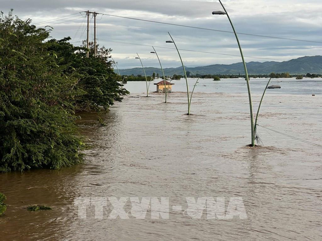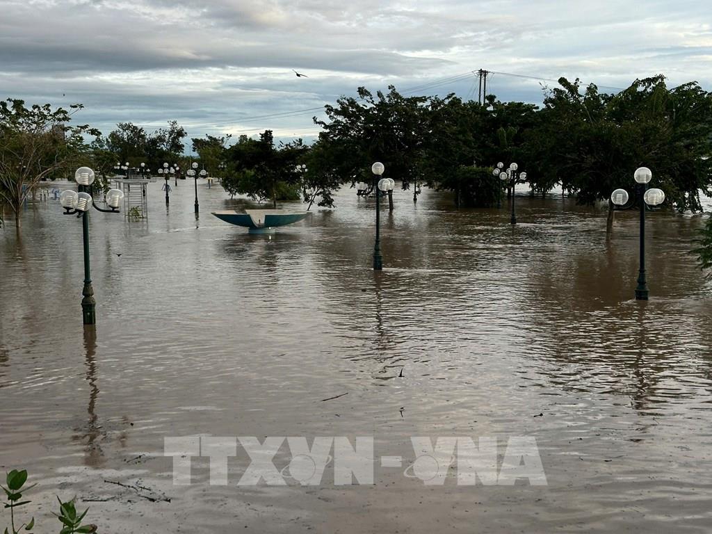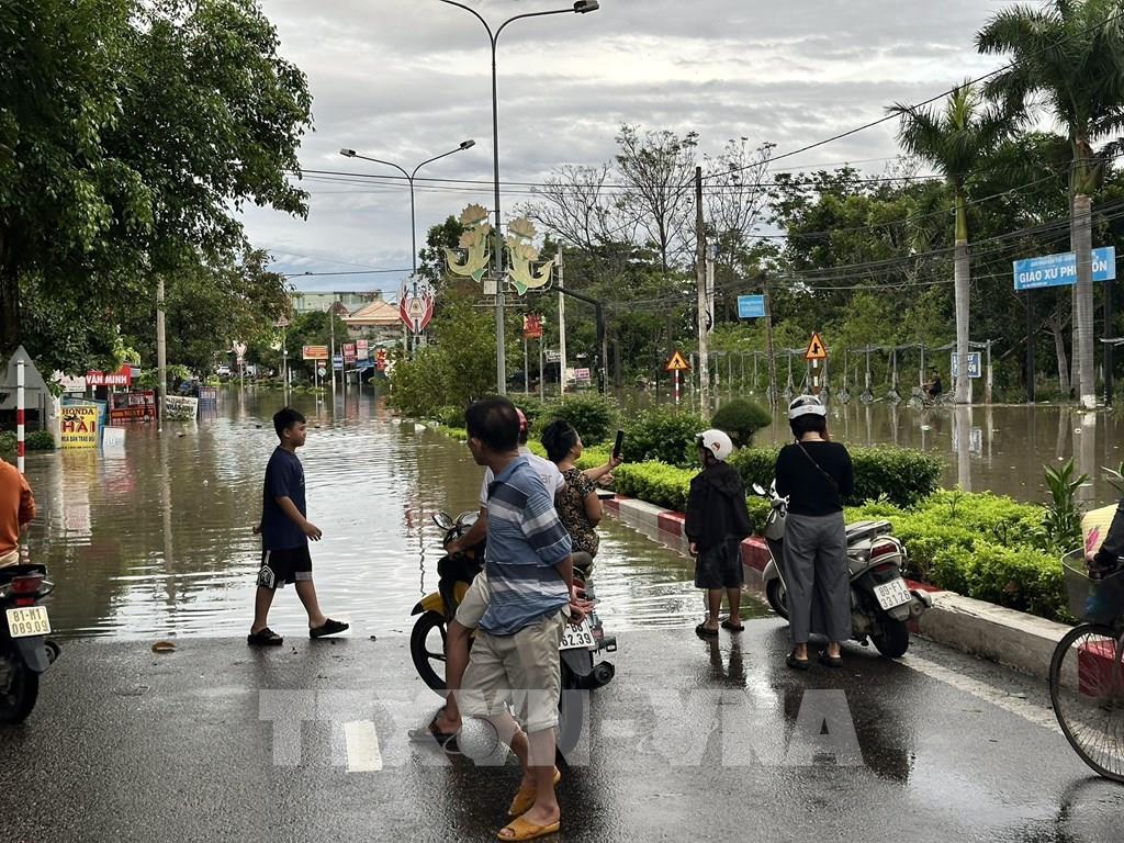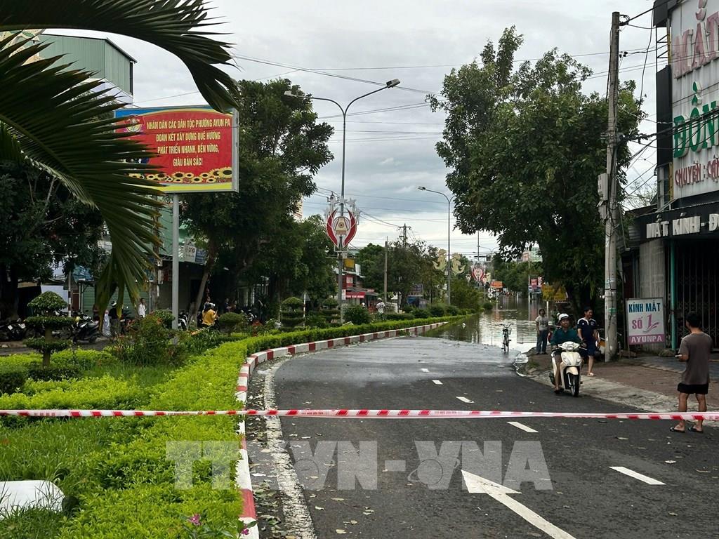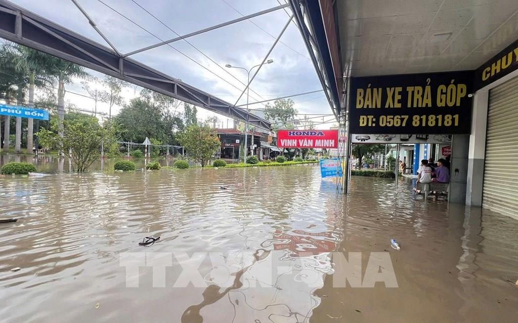 Tuyến đường tại phường Ayunpa (Gia Lai) bị ngập sâu trong nước. Ảnh: Hoài Nam - TTXVN