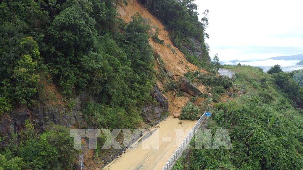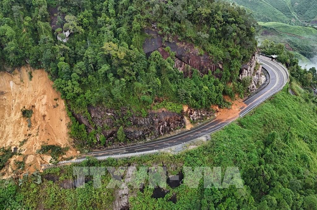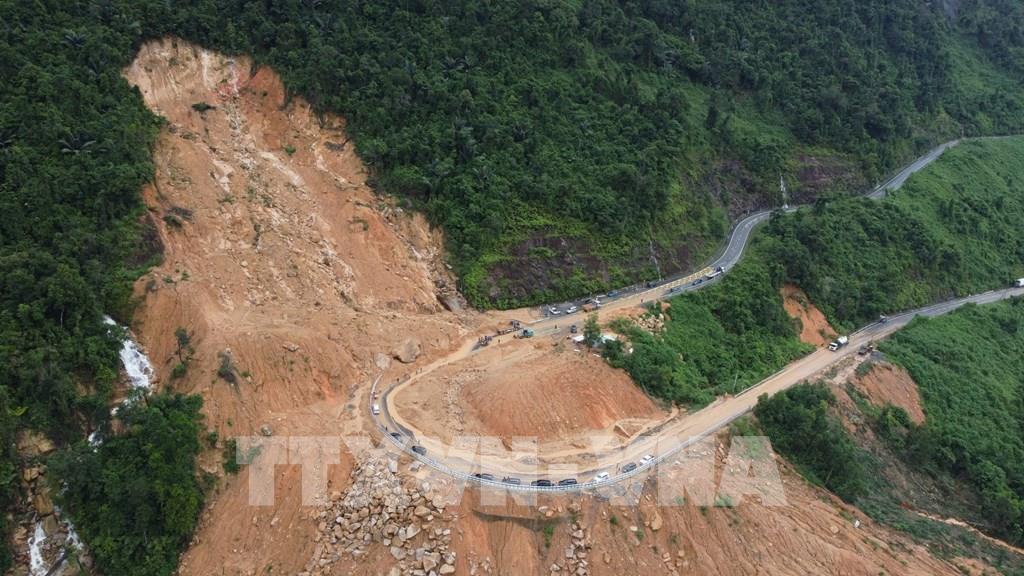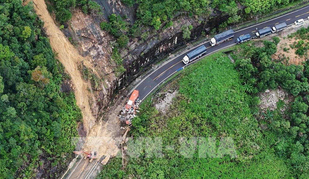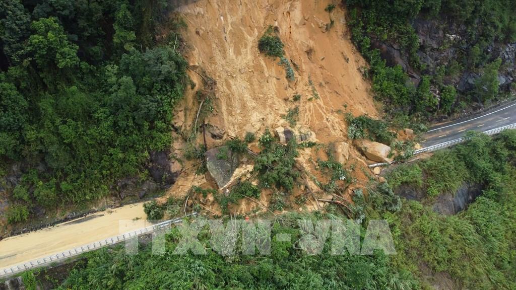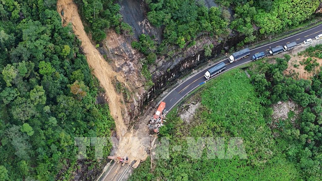 Đất, đá từ trên cao rơi xuống khiến cho xe chở khách gặp tai nạn (có 6 người tử vong và 19 người bị thương. Những hình ảnh từ trên cao mà phóng viên TTXVN ghi lại được vào chiều 17/11/2025 cho thấy hàng trăm m3 đất đá tràn xuống mặt đường khiến việc lưu thông qua khu vực này hoàn toàn bị "tê liệt".