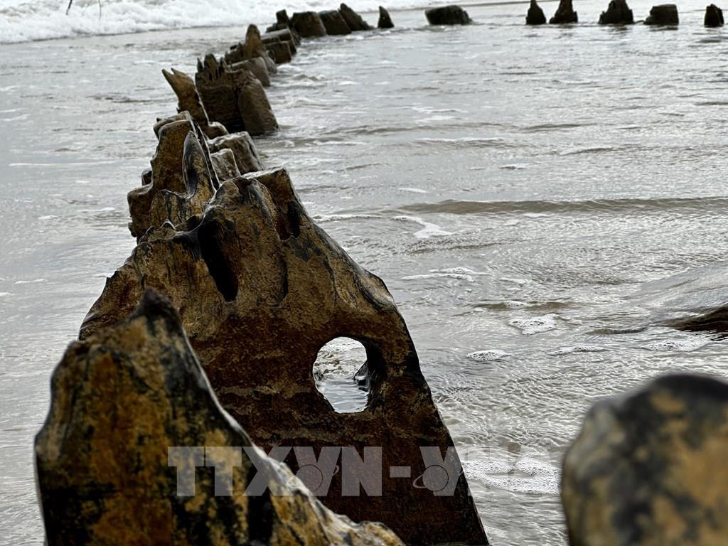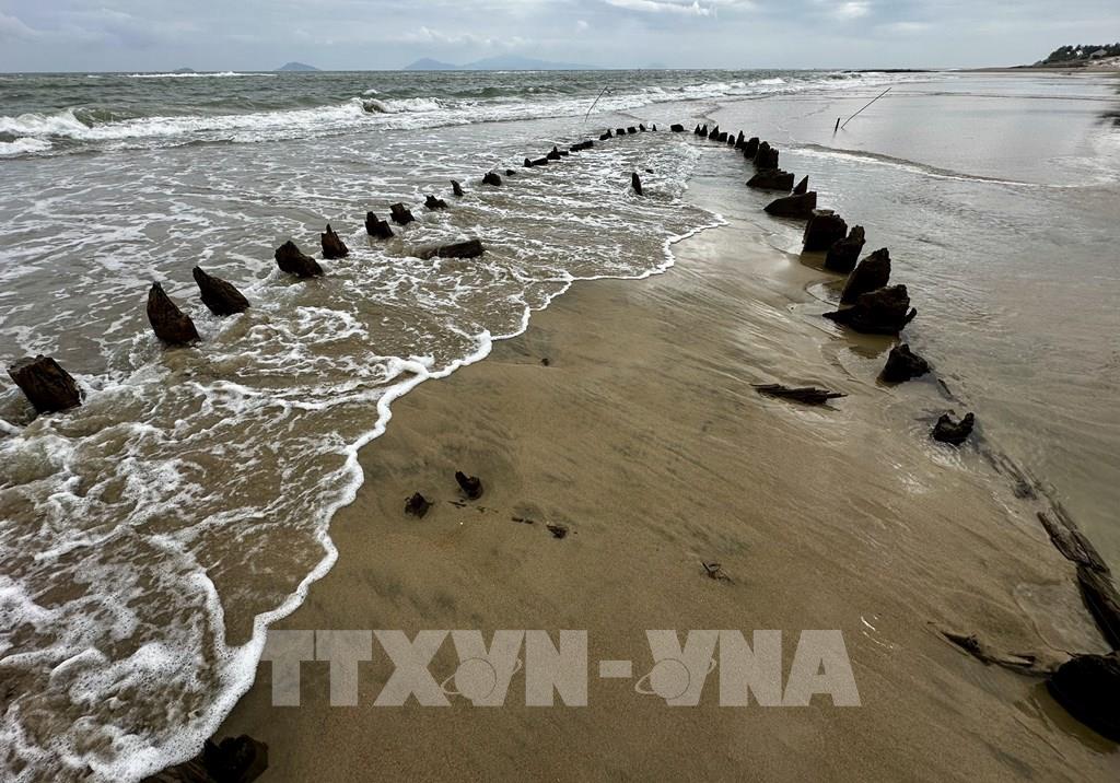 Phần khung gỗ con tàu nổi trên mặt cát. Ảnh: Trần Lê Lâm - TTXVN