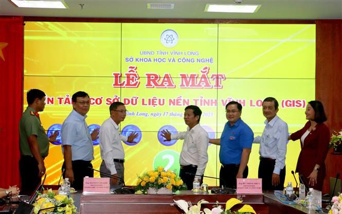 Đại biểu thực hiện nghi thức ra mắt Nền tảng Cơ sở dữ liệu nền tỉnh Vĩnh Long. Ảnh: Lê Thúy Hằng – TTXVN
