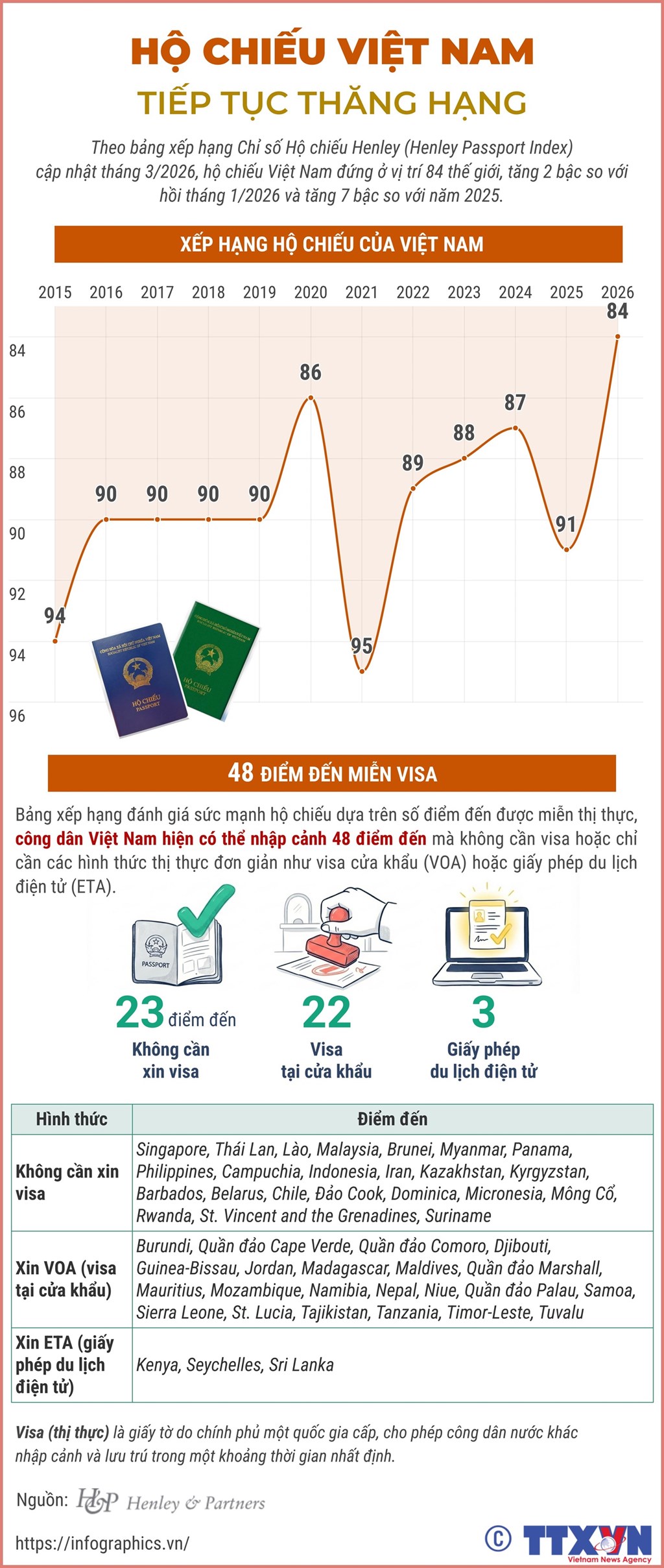 Hộ chiếu Việt Nam đứng ở vị trí 84 thế giới, tăng 2 bậc so với hồi tháng 1/2026 và tăng 7 bậc so với năm 2025. Ảnh: Infographics.Vn