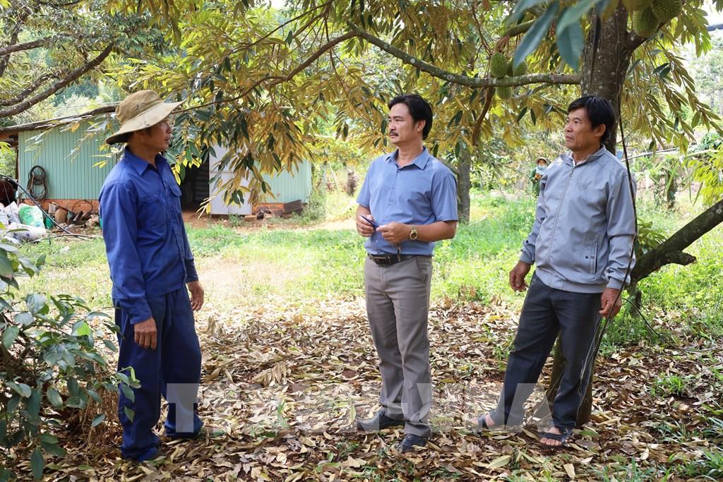 10ha sầu riêng xen lẫn cà phê và bơ của nhà ông Nguyễn Văn Điển (áo xanh bên trái) đang có nguy cơ thiếu nước dù gia đình đã làm ao bạt, khoan giếng... Ảnh: Đậu Tất Thành – TTXVN