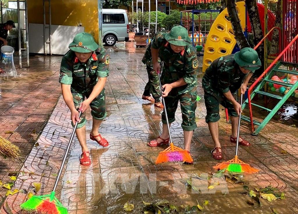 Ban Chỉ huy Phòng thủ Khu vực 4 - Triệu Phong (Bộ Chỉ huy Quân sự tỉnh Quảng Trị) huy động cán bộ, chiến sĩ và lực lượng dân quân xã Diên Sanh giúp đỡ địa phương khắc phục hậu quả sau mưa lũ. Ảnh: TTXVN phát