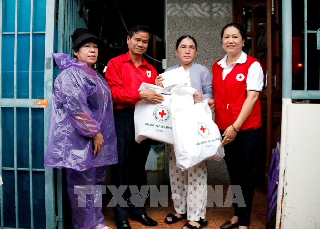 Hội Chữ thập đỏ Việt Nam tỉnh Lâm Đồng trao quà hỗ trợ cho người dân phường Bình Thuận (Lâm Đồng) bị thiệt hại nặng do mưa lũ. Ảnh: Nguyễn Thanh - TTXVN