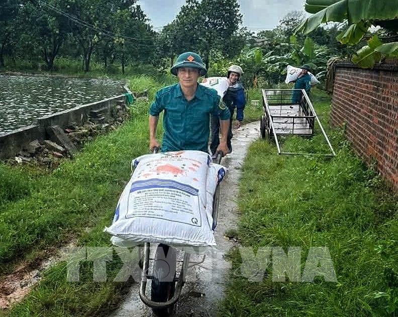 Cán bộ, chiến sĩ Lữ đoàn 409 và Bộ Chỉ huy quân sự tỉnh giúp Nhân dân xã Xuân Lương, tỉnh Bắc Ninh di chuyển người và tài sản. Ảnh: TTXVN phát