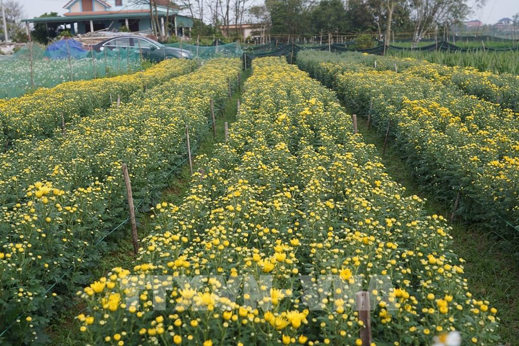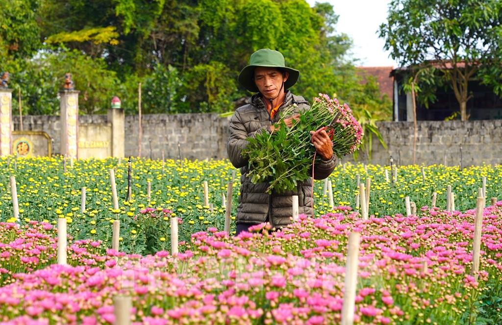 Ông Nguyễn Hữu Khiều chia sẻ, năm nay thời tiết thất thường, lúc xuống giống thì mưa nhiều, sau đó lại nắng ấm kéo dài nên đào nở sớm gây thất thu. Đối với các loại hoa ngắn ngày như cúc, ly, thạch thảo… thì phát triển tốt hơn, hiện thương lái đặt mua cũng gần hết. Chỉ mong từ nay đến Tết thời tiết ổn định, giá cả khá hơn để bù lại chi phí đầu tư, có thêm thu nhập lo cho gia đình trong dịp Tết năm nay… Kỳ vọng vụ Tết được giá Cách đó không xa, tại vườn hoa của ông Nguyễn Quang Huyên (48 tuổi), thôn 3, xã Nam Trạch, không khí sản xuất cũng đang bước vào cao điểm. Vụ Tết năm nay gia đình ông Huyên canh tác trên diện tích hơn 4 sào (khoảng 2.000 m²), chủ yếu là cúc, hoa thạch thảo và một số giống hoa ngắn ngày khác với tổng số khoảng 40.000 cây và cành hoa. Nhờ có đầu ra tương đối ổn định, giá bán theo thị trường, sản lượng hiện vẫn chưa đủ đáp ứng nhu cầu tiêu thụ.Có hơn 20 năm kinh nghiệm trồng hoa, để hoa nở đúng dịp Tết, ông Huyên áp dụng quy trình chăm sóc chặt chẽ, từ khâu chọn giống, xử lý đất, bón phân theo từng giai đoạn sinh trưởng đến điều tiết nước hệ thống tưới phu sương nhằm giữ ẩm, ổn định nhiệt độ cho vườn hoa. Thời điểm cận Tết, các luống hoa được theo dõi sát sao, chủ động phòng trừ sâu bệnh, cắt nhánh, tỉa cành, nâng niu từng chậu hoa, chăm chút cho từng bông hoa trong công đoạn cuối cùng trước khi xuất vườn để cung cấp cho thị trường các nơi.