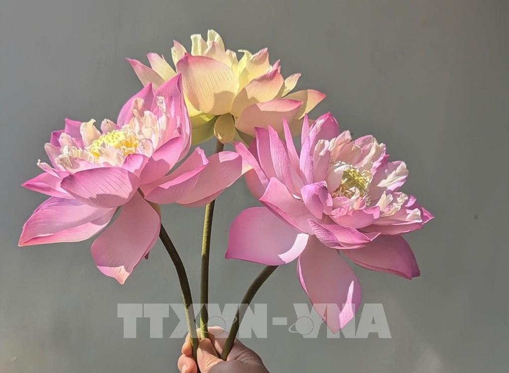 Hoa sen đất sét được làm thủ công từng chi tiết nhỏ. Ảnh: Huyền Trang - TTXVN