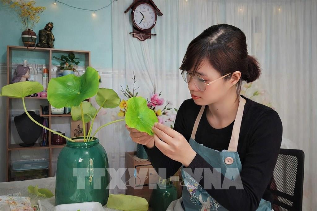 Chị Đàm Thị Ly, phường Thuận An chủ xưởng hoa sen làm từ đất sét đang gia công sản phẩm. Ảnh: Huyền Trang - TTXVN