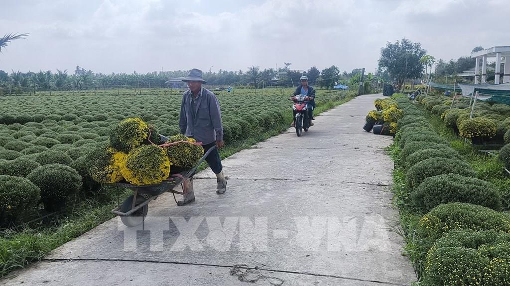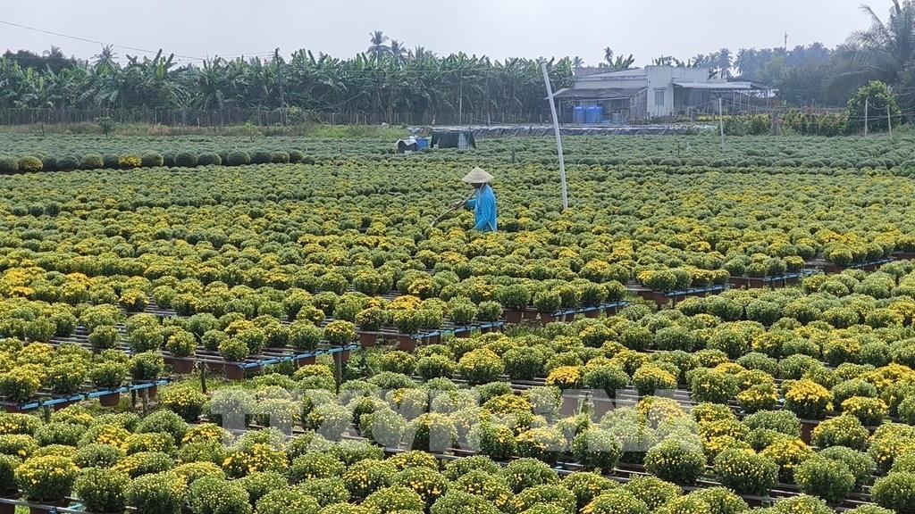 Chăm sóc vườn cúc mâm xôi tại xã Chợ Lách, tỉnh Vĩnh Long. Ảnh: Huỳnh Phúc Hậu - TTXVN