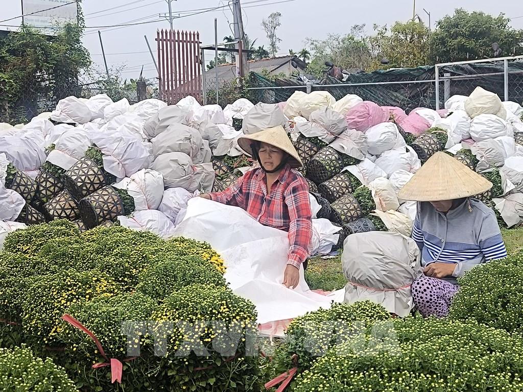 Chuẩn bị đóng gói cúc mâm xôi giao cho thương lái đi tiêu thụ. Ảnh: Huỳnh Phúc Hậu - TTXVN