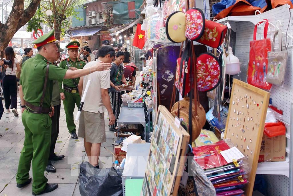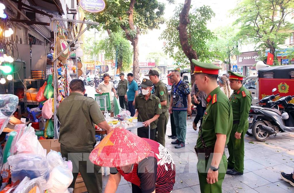 Tổ công tác của Công an phường Hoàn Kiếm xử lý vi phạm về trật tự đô thị tại phố Trần Phú. Ảnh: Phạm Kiên - TTXVN