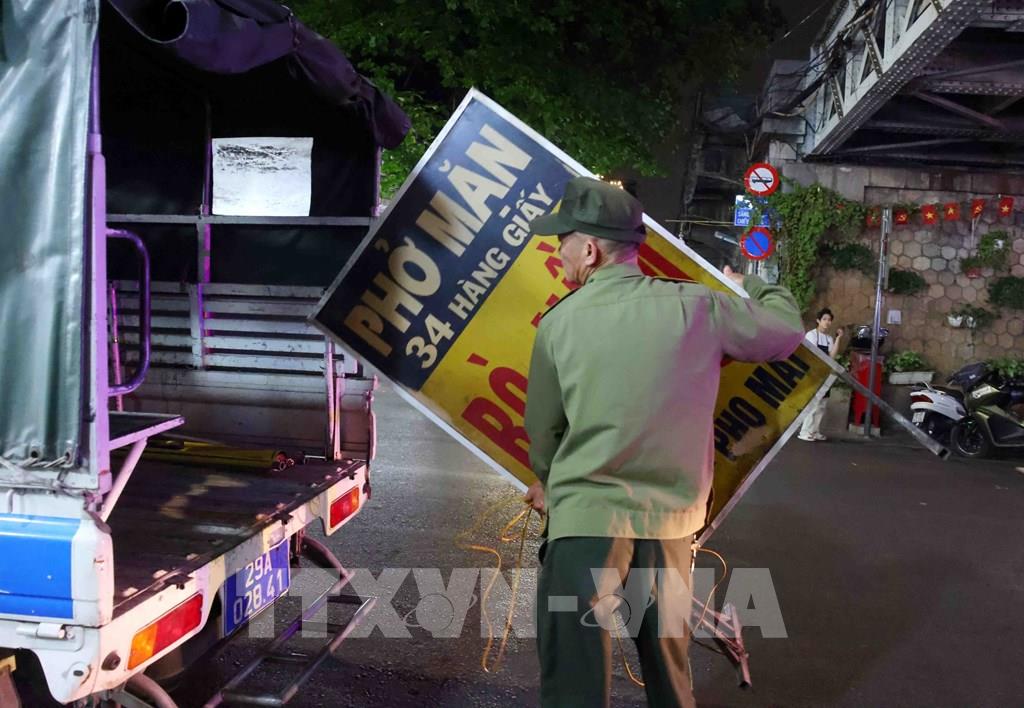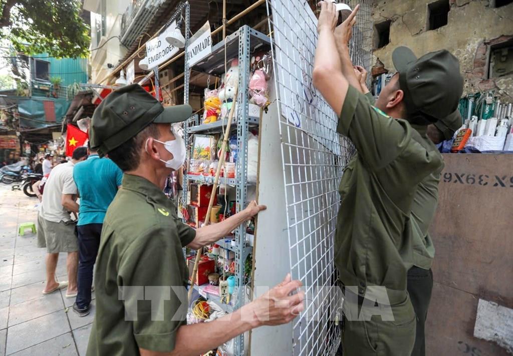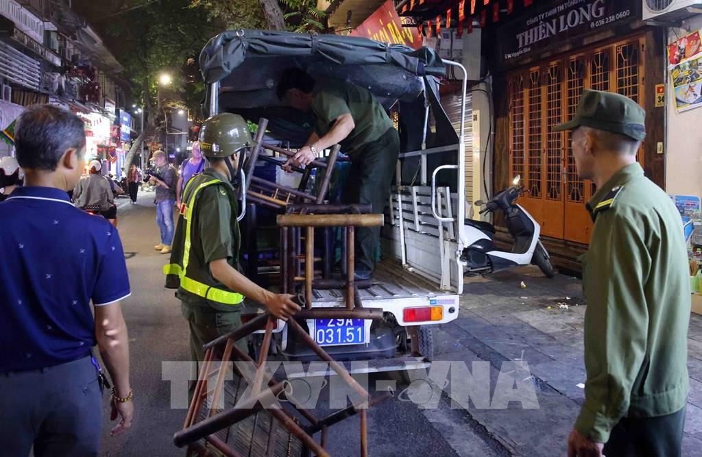 Với những trường hợp lấn chiếm vỉa hè làm nơi kinh doanh, lực lượng chức năng phường Hoàn Kiếm kiên quyết tháo dỡ, tịch thu tang vật và lập biên bản xử lý. Ảnh: Phạm Kiên - TTXVN