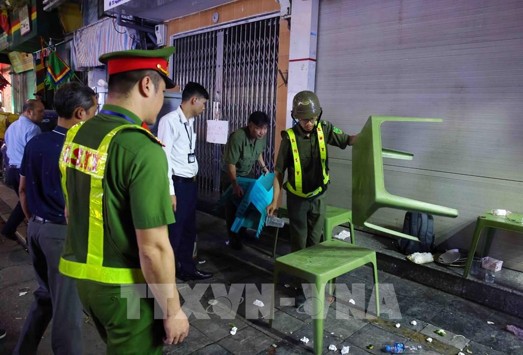 Tổ công tác Công an phường Hoàn Kiếm phát hiện và thu giữ tang vật của một cơ sở kinh doanh dịch vụ ăn uống lấn chiếm vỉa hè trên phố Nguyễn Siêu. Ảnh: Phạm Kiên - TTXVN