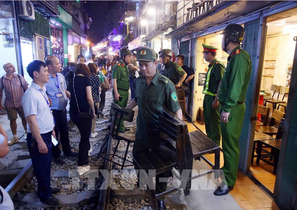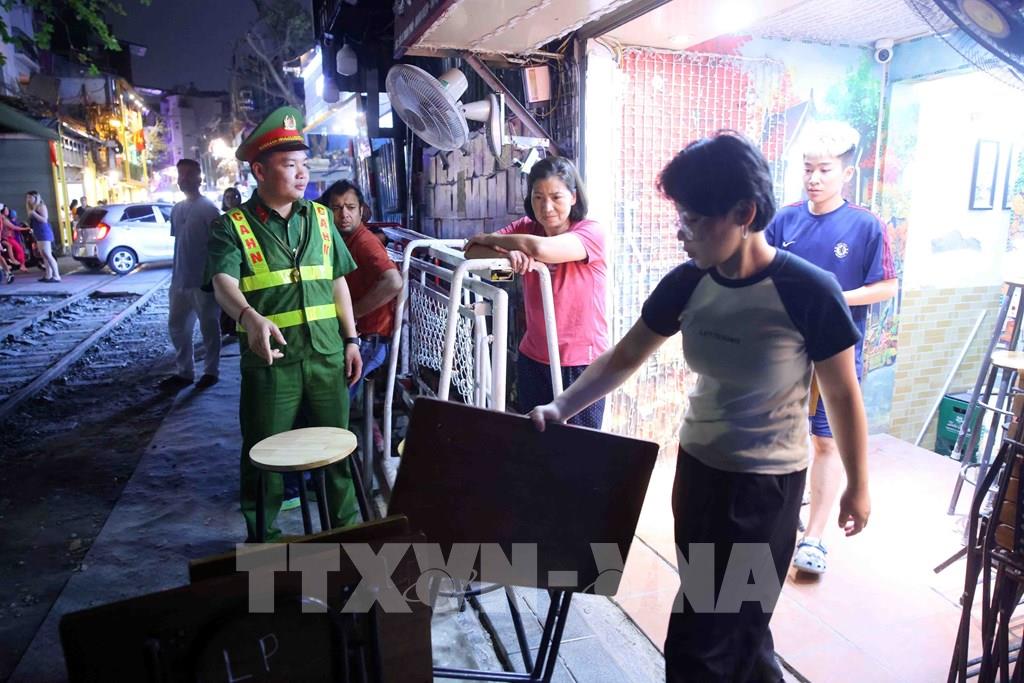 Tại khu vực "cà phê đường tàu", nhiều cơ sở kinh doanh đồ uống tự ý kê bàn ghế sát đường ray, thu hút du khách chụp ảnh, tiềm ẩn nguy cơ mất an toàn. Công tác xử lý được triển khai nhanh chóng nhằm bảo đảm an toàn cho các chuyến tàu qua khu vực. Ảnh: Phạm Kiên - TTXVN