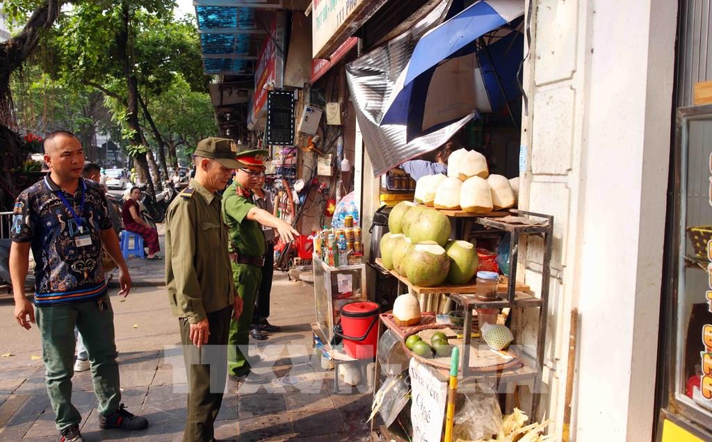 Tổ công tác của Công an phường Hoàn Kiếm xử lý vi phạm về trật tự đô thị tại phố Phủ Doãn. Ảnh: Phạm Kiên - TTXVN