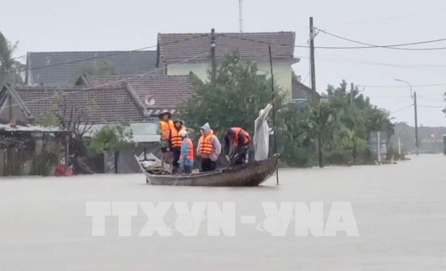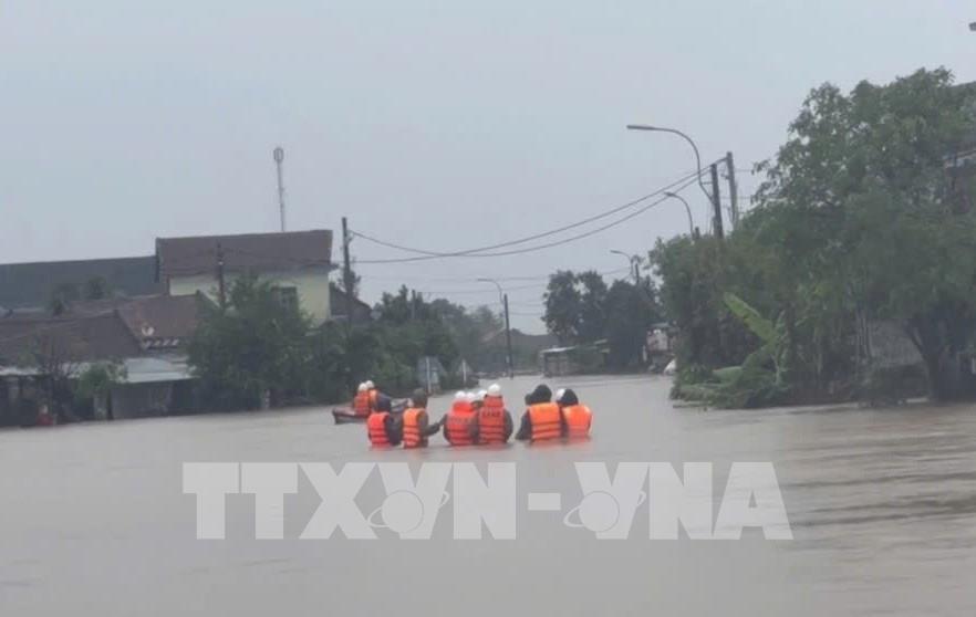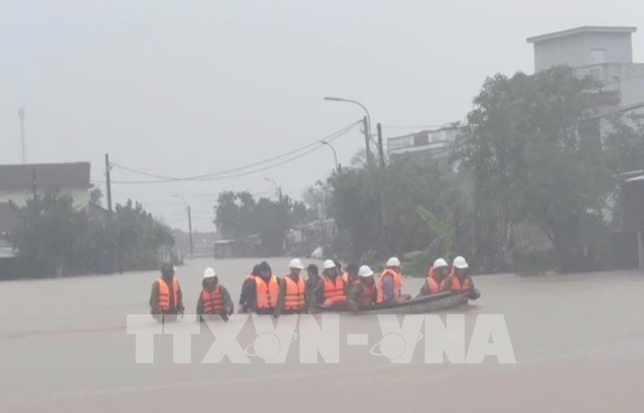 Công an giải cứu thành công gần 200 người dân bị mắc kẹt trong vùng ngập sâu tại thôn Tân Mỹ, xã Sơn Thành. Ảnh: TTXVN phát