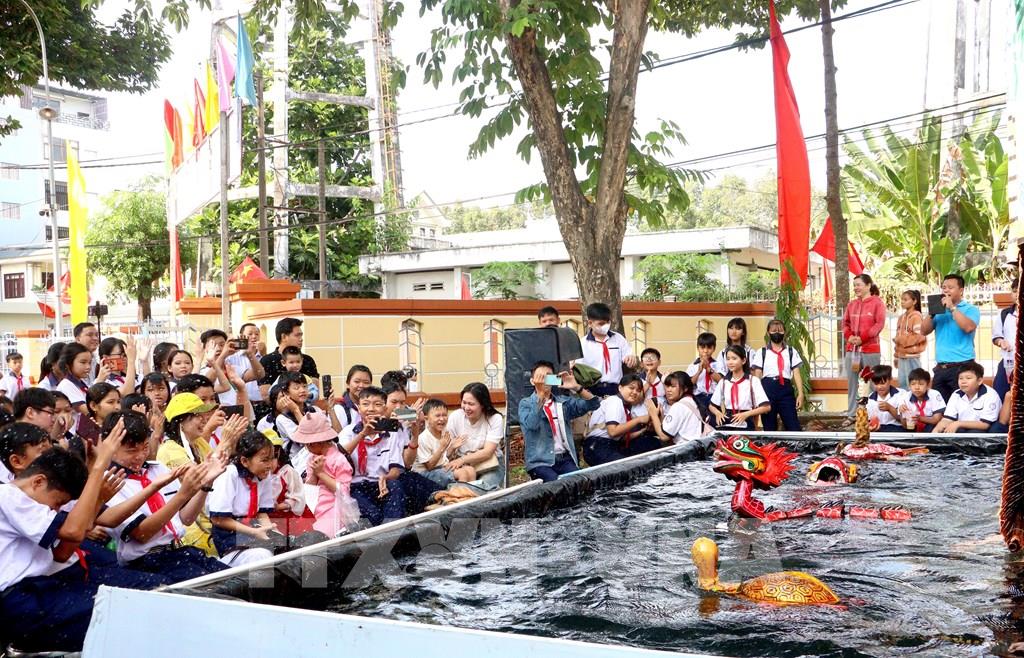 Học sinh phấn khởi xem biểu diễn múa rối nước. Ảnh: Lê Thúy Hằng – TTXVN