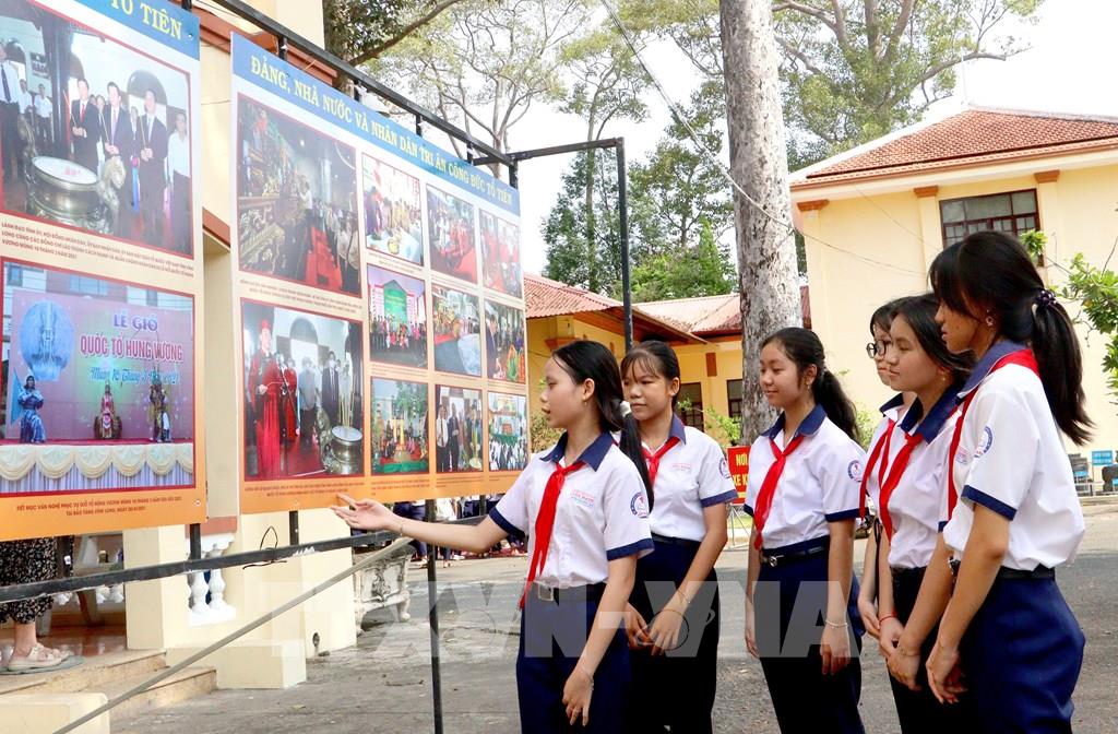 Học sinh tham quan trưng bày hình ảnh về hoạt động Giỗ Tổ Hùng Vương tại tỉnh Vĩnh Long qua các thời kỳ. Ảnh: Lê Thúy Hằng – TTXVN