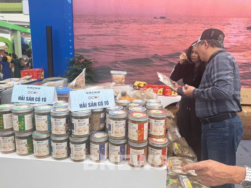Trong không gian hội chợ năm nay là khu trưng bày của tỉnh Quảng Ninh với diện tích 200m², được thiết kế ấn tượng, phản ánh rõ nét bản sắc vùng mỏ năng động, hiện đại nhưng vẫn giữ đậm dấu ấn văn hóa địa phương. Gian hàng giới thiệu hàng loạt sản phẩm OCOP và đặc sản tiêu biểu như hải sản Cô Tô, nước mắm sá sùng Vân Đồn, trà hoa vàng Quy Hoa, ruốc hải sản Vân Đồn hay miến dong Bình Liêu, những thương hiệu đã khẳng định chất lượng và chỗ đứng trên thị trường.