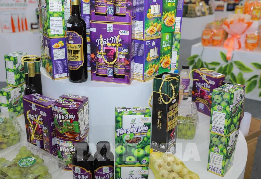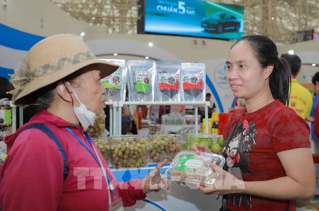 Các sản phẩm nho, táo và rong biển đạt tiêu chuẩn OCOP của cơ sở nông sản xanh Trang Huỳnh, xã Phước Dinh, tỉnh Khánh Hoà tại Hội chợ mùa Thu. Ảnh: Phan Phương – TTXVN