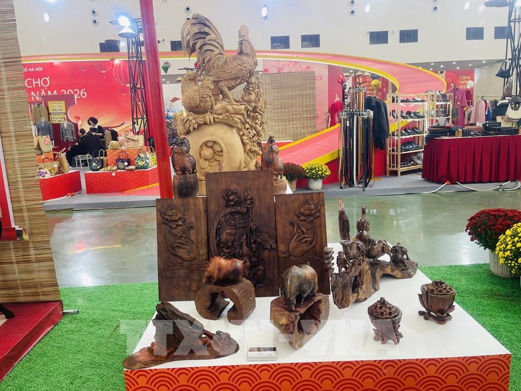 Các tác phẩm gỗ mỹ nghệ làng nghề Thiết Úng, xã Đông Anh (Hà Nội) được bày bán tại Hội chợ Mùa Xuân 2026. Ảnh: Tuyết Mai - TTXVN