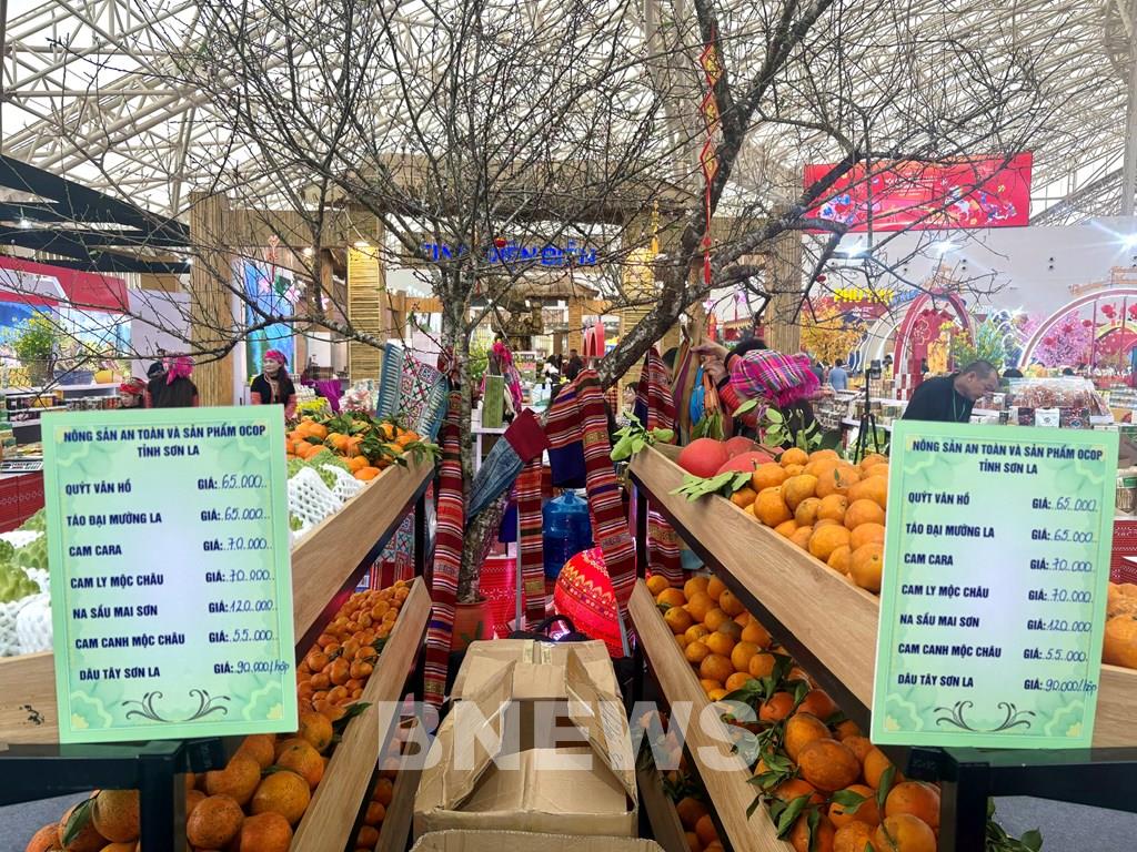 Sắc xuân Tây Bắc tràn ngập không gian trưnhg bày sản phẩm của tỉnh Sơn La tại hội chợ màu Xuân 2026. Ảnh: Anh Nguyễn/Bnews/vnanet.vn
