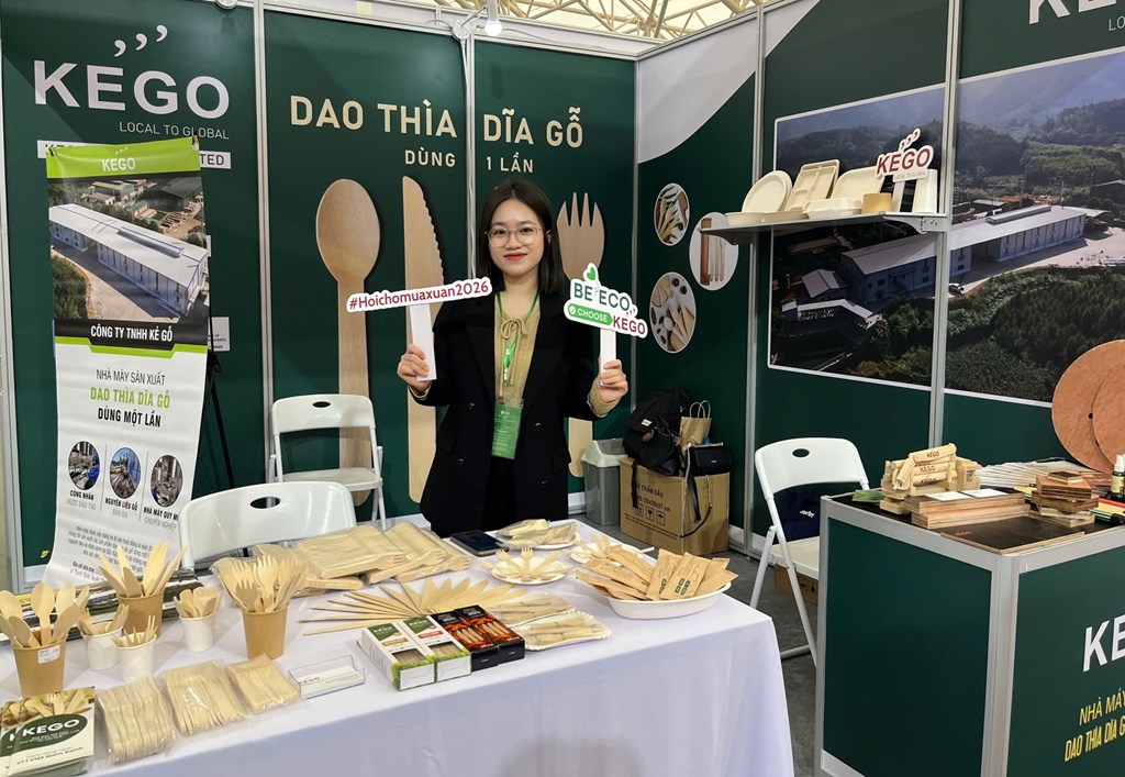 Công ty TNHH Kẻ Gỗ mang đến Hội chợ Mùa Xuân năm 2026 các sản phẩm dùng một lần thân thiện môi trường thay thế sản phẩm từ nhựa. Ảnh: Bích Hồng/Bnews/vnanet.vn
