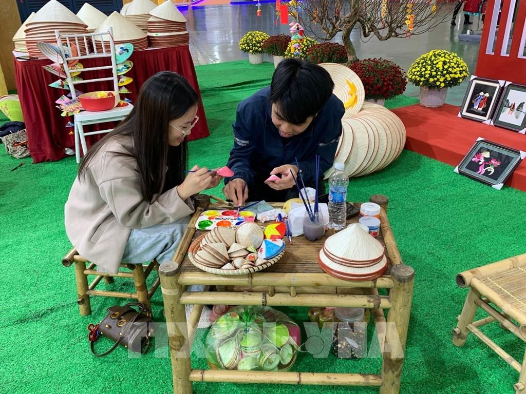 Khách tham quan trang trí nón lá tại hội chợ. Ảnh: Hạnh Quyên-TTXVN