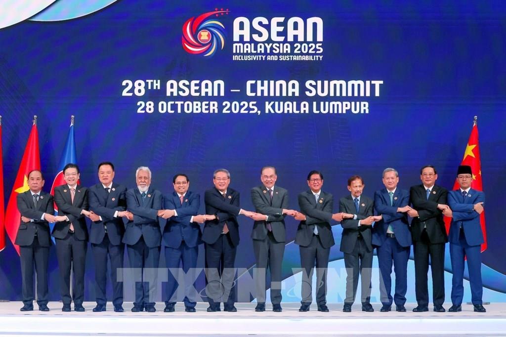 Thủ tướng Phạm Minh Chính cùng trưởng đoàn các nước ASEAN và Thủ tướng Trung Quốc Lý Cường tham dự Hội nghị Cấp cao ASEAN - Trung Quốc lần thứ 28. Ảnh: Dương Giang-TTXVN