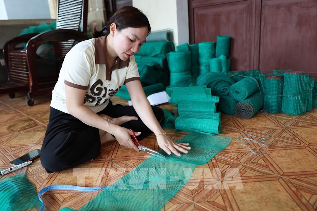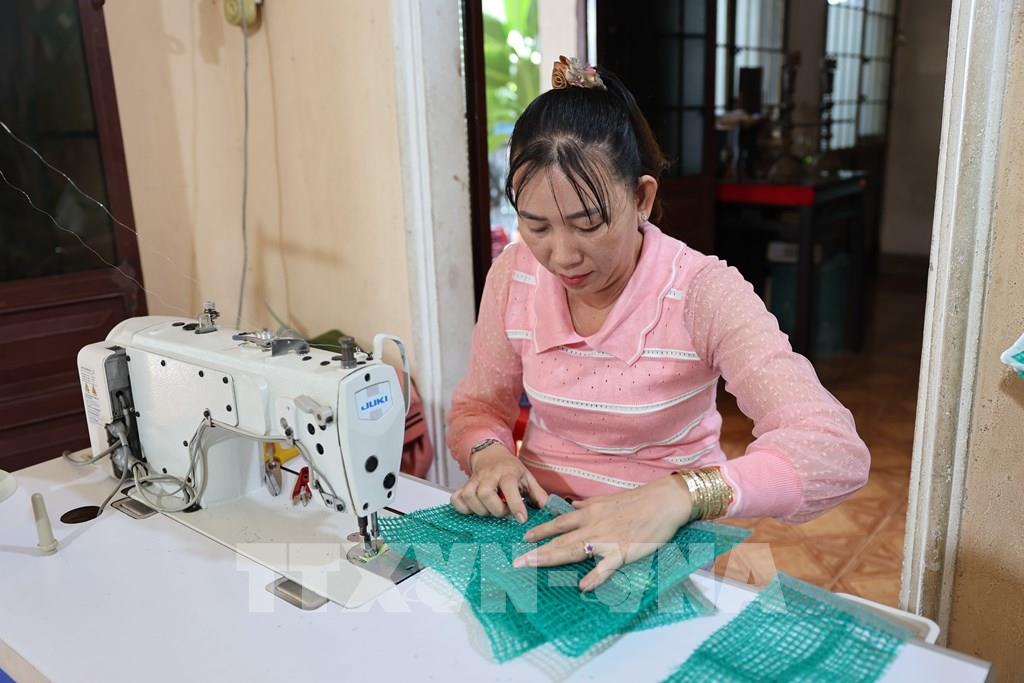 Bà Trần Thị Mỹ, ngụ xã Long Sơn, có thu nhập ổn định khoảng 200.000 đồng/ngày nhờ làm túi lưới. Ảnh: Hoàng Nhị – TTXVN