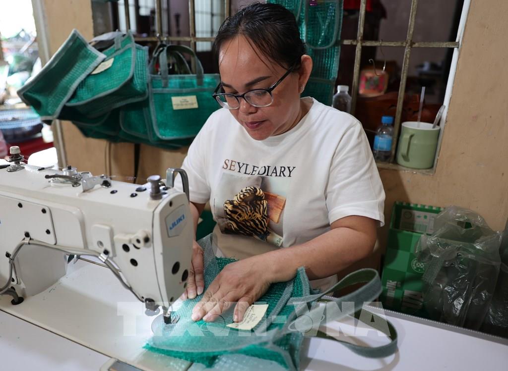 Mô hình may túi từ những mảnh lưới vụn đang mở ra hướng sinh kế mới ổn định cho phụ nữ xã Long Sơn. Ảnh: Hoàng Nhị - TTXVN