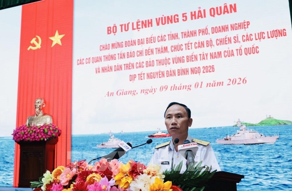 “Những năm qua, Vùng 5 Hải quân luôn nhận được sự quan tâm, yêu thương, đùm bọc, giúp đỡ tận tình của cấp ủy, chính quyền và nhân dân cả nước. Đặc biệt, trong những ngày đầu năm 2026, cán bộ, chiến sĩ, các lực lượng và nhân dân trên các tuyến đảo Tây Nam rất xúc động khi được đón đoàn đại biểu các tỉnh, thành phố, các tổ chức, doanh nghiệp cùng phóng viên các cơ quan thông tấn, báo chí Trung ương và địa phương đến thăm, động viên, chúc Tết nhân dịp xuân Bính Ngọ.