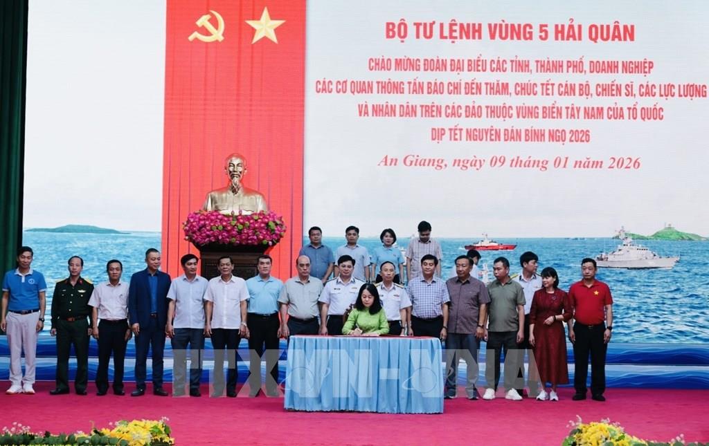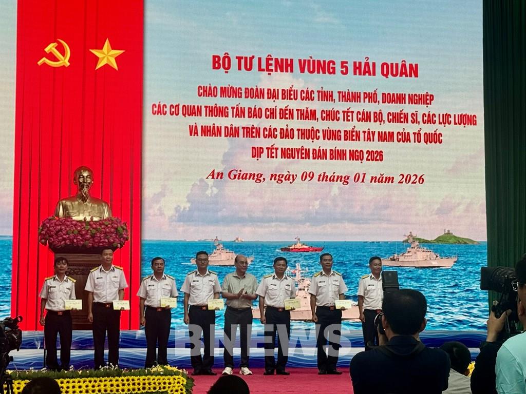 Chiều 9/1, tại đặc khu Phú Quốc, tỉnh An Giang, Bộ Tư lệnh Vùng 5 Hải quân tổ chức gặp mặt đoàn đại biểu các tỉnh, thành phố, doanh nghiệp và các cơ quan thông tấn báo chí đến thăm, chúc Tết cán bộ, chiến sĩ, các lực lượng và nhân dân trên các đảo thuộc vùng biển Tây Nam, nhân dịp Tết Nguyên đán Bính Ngọ 2026.