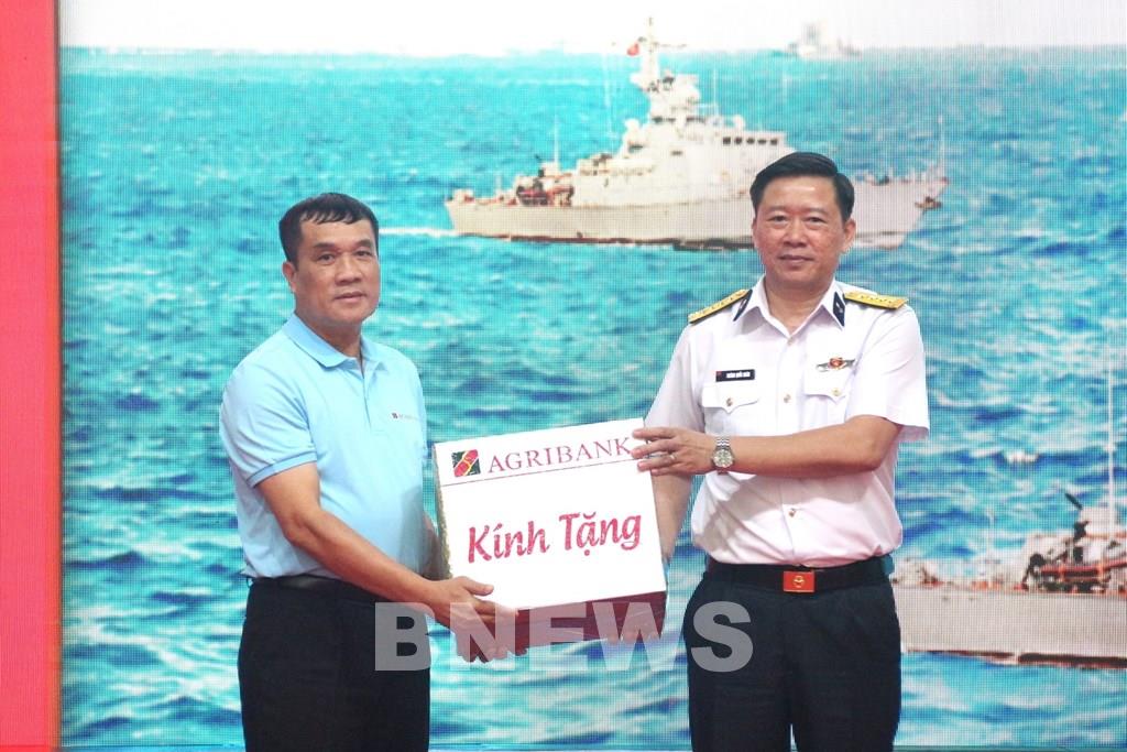 Ông Hoàng Văn Thắng, Trưởng khối Truyền thông và Thương hiệu Ngân hàng Agribank, tặng quà Bộ Tư lệnh Vùng 5 Hải quân. Ảnh: Thanh Hương - TTXVN