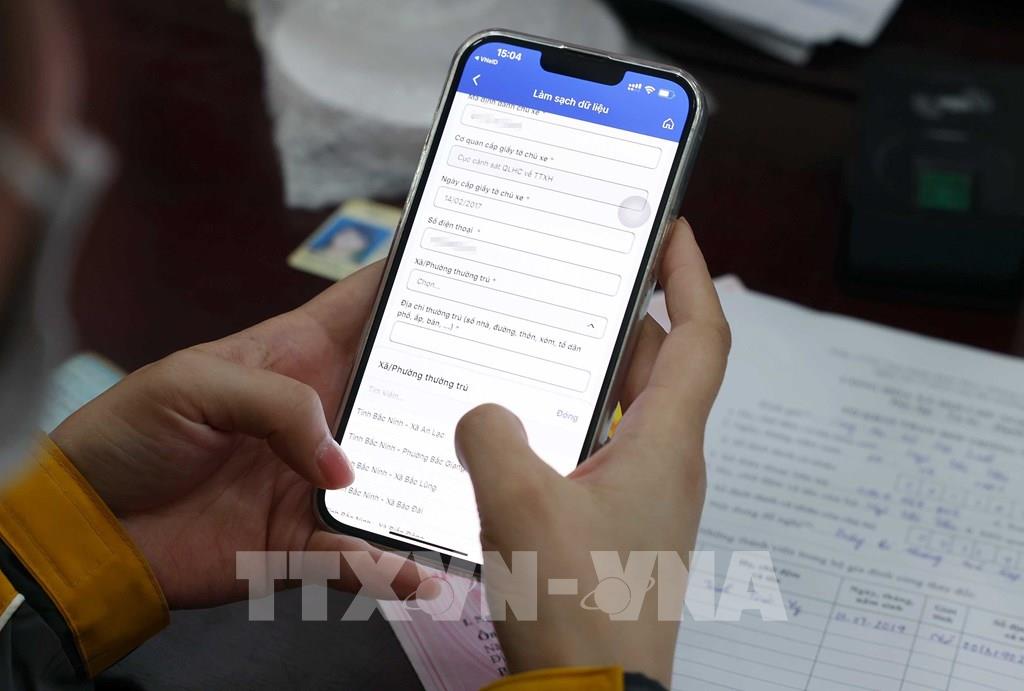 Để thực hiện khai báo, người dân cài đặt và mở ứng dụng iHanoi trên điện thoại di động, sau đó, đăng nhập vào ứng dụng bằng số điện thoại (nếu chưa có tài khoản thì đăng ký) hoặc đăng nhập thông qua ứng dụng VNeID. Tiếp đó, chọn mục 'Làm sạch dữ liệu' trên màn hình chính của ứng dụng iHanoi rồi khai báo thông tin về "Giấy phép lái xe" và "Đăng ký xe”. Ảnh: Phạm Kiên - TTXVN