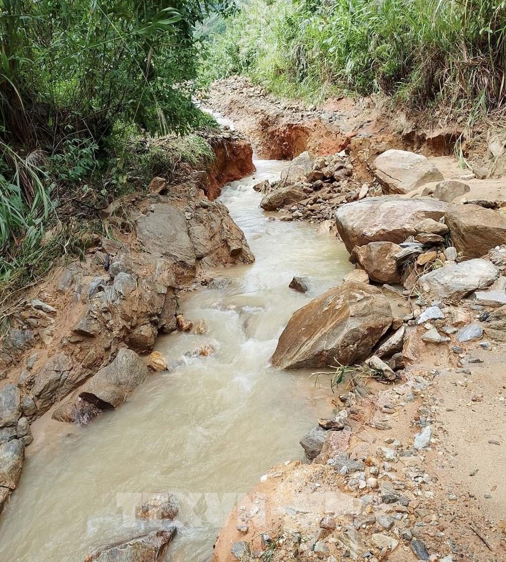 Tuyến đường từ trung tâm UBND xã Cà Đam đi thôn Tang bị đứt gãy, sạt lở nghiêm trọng. Ảnh: TTXVN phát