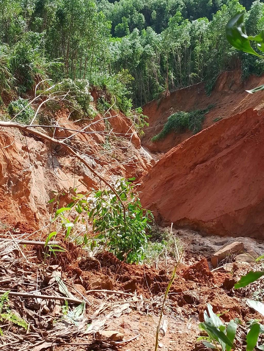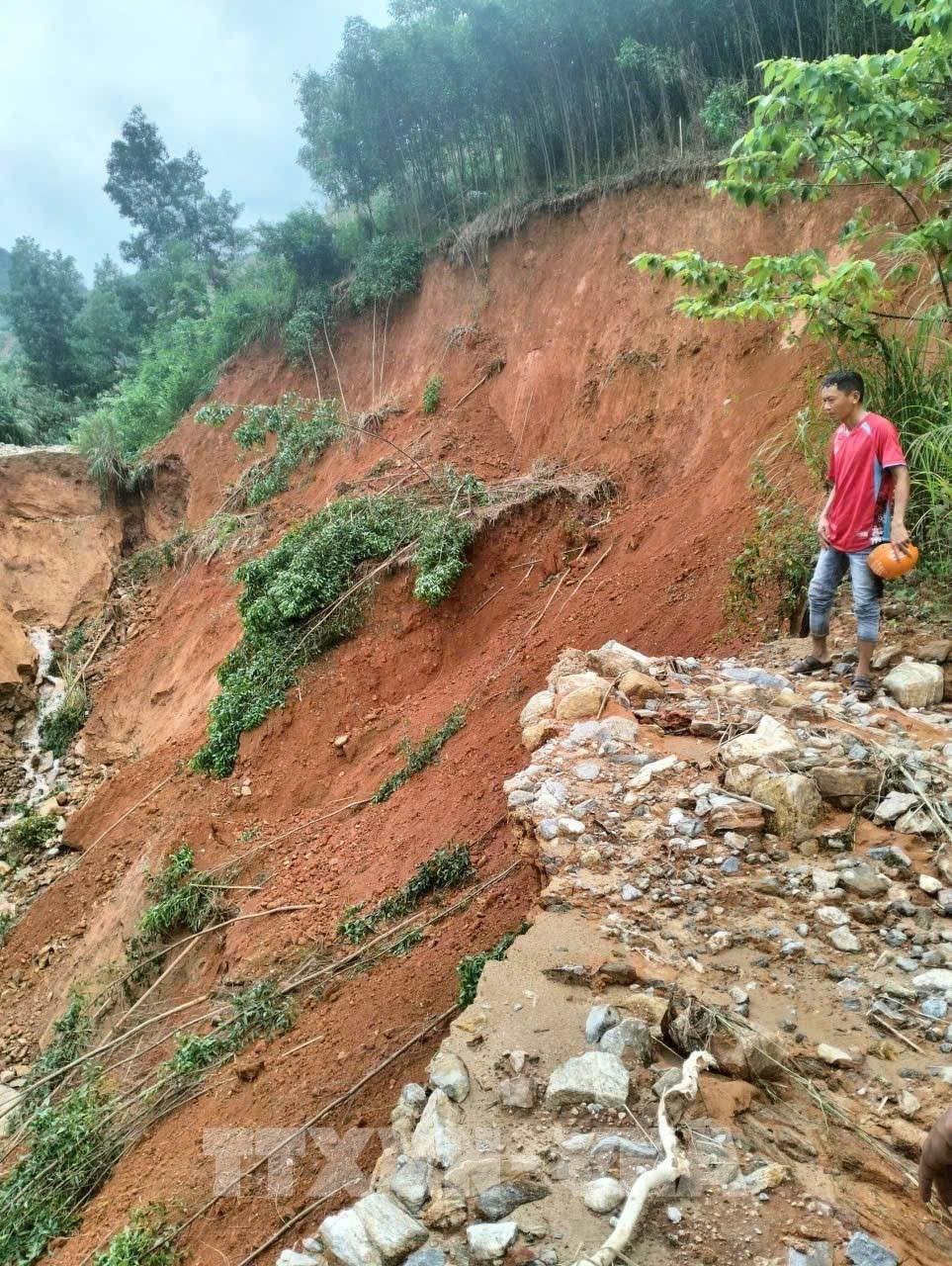 Tuyến đường từ trung tâm UBND xã Cà Đam đi thôn Tang bị đứt gãy chiều dài 50m, độ sâu 35m. Ảnh: TTXVN phát