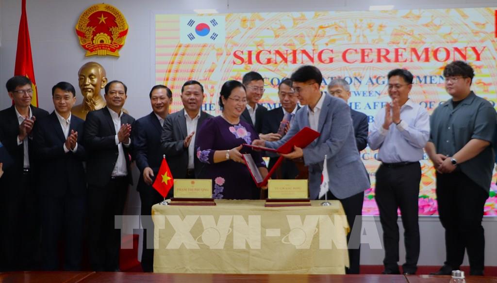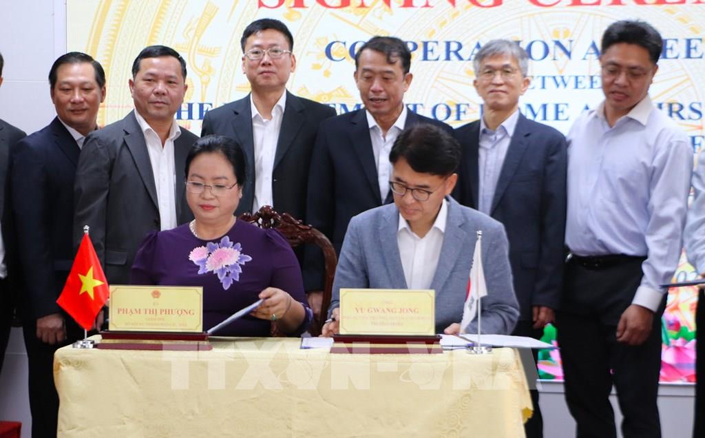 Ký kết thỏa thuận hợp tác giữa Sở Nội Vụ thành phố Cần Thơ và huyện Cheorwon về nội dung cử và tiếp nhận lao động thời vụ. Ảnh: Nguyễn Hằng - TTXVN