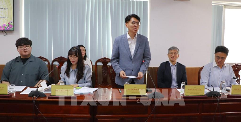 Ông Yu Gwang Jong, Phó huyện trưởng huyện Cheorwon, Trưởng đoàn công tác, trao đổi tại buổi làm việc. Ảnh: Nguyễn Hằng - TTXVN
