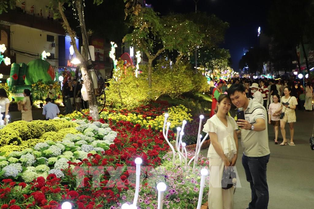 Đường hoa Xuân Bính Ngọ là một trong những điểm nhấn thu hút đông du khách trong kỳ nghỉ Tết. Ảnh: Nguyễn Hằng - TTXVN
