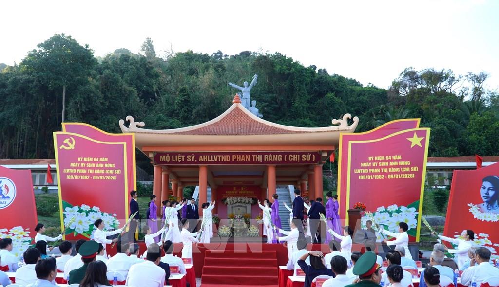 Nghi thức dâng hoa tri ân, tưởng nhớ nữ Anh hùng Lực lượng vũ trang Nhân dân - Liệt sĩ Phan Thị Ràng (chị Sứ). Ảnh: Văn Sĩ - TTXVN