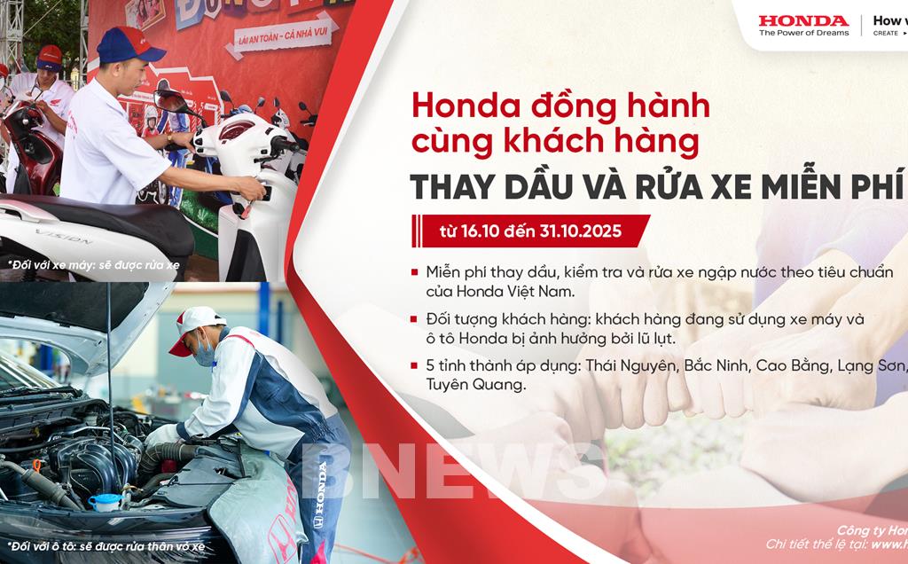 Chương trình diễn ra từ ngày 16/10 đến hết 31/10/2025, áp dụng cho khách hàng sở hữu xe ô tô và xe máy Honda bị ảnh hưởng bởi mưa lũ. Cụ thể: Đối với ô tô Honda: miễn phí thay dầu động cơ, thay dầu hộp số, kiểm tra và vệ sinh thân vỏ. Đối với xe máy Honda: miễn phí thay dầu động cơ, kiểm tra và vệ sinh thân vỏ.