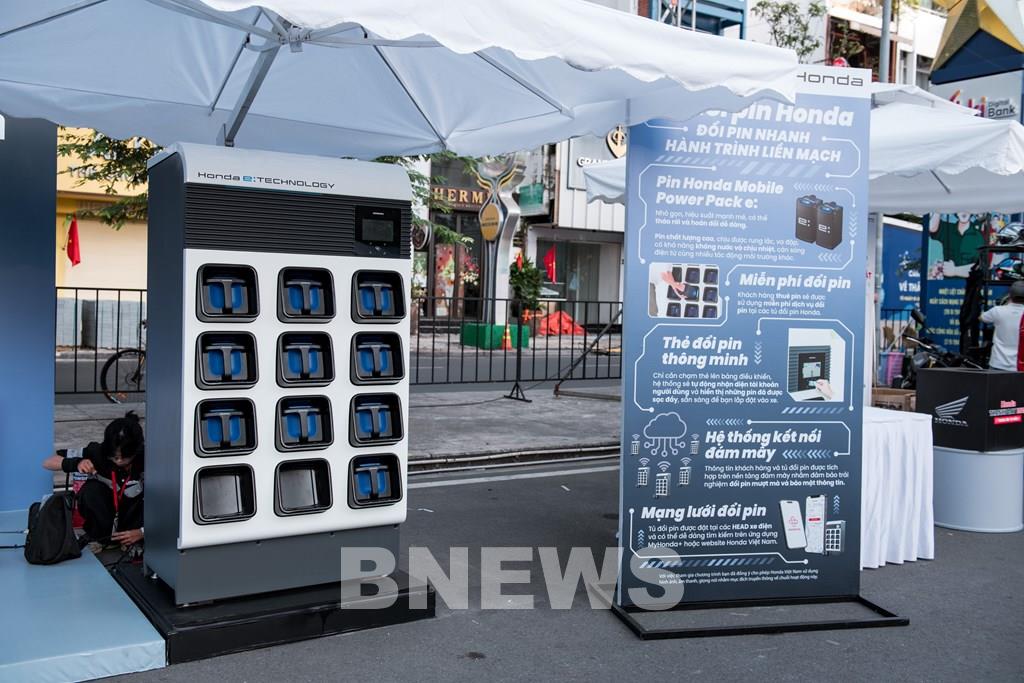 Hệ thống trạm sạc pin (Honda Motor Charger Hub) và trạm đổi pin (Honda e: Swap BATTERY STATION) đều được triển khai tại các HEAD Kinh doanh xe điện và bắt đầu từ các thành phố lớn. Ảnh: Văn Xuyên/BNEWS/TTXVN