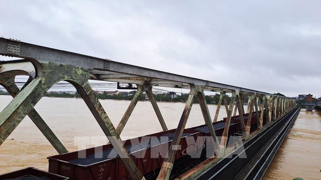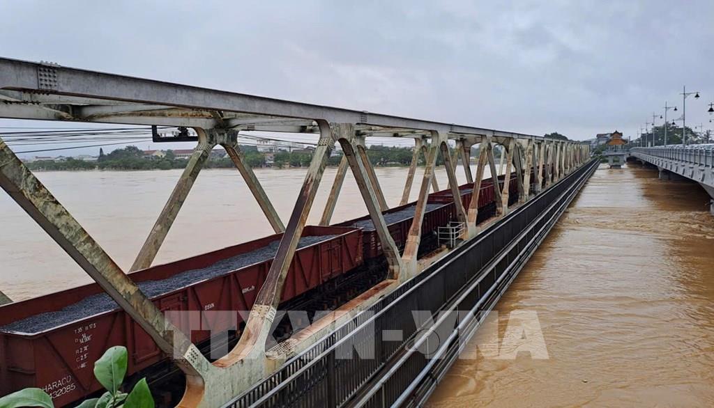 Những toa xe lửa chở đá dừng trên cầu đường sắt Bạch Hổ bắc qua sông Hương, thành phố Huế để gia tải ứng phó với lũ lớn. Ảnh: Nguyên Lý-TTXVN