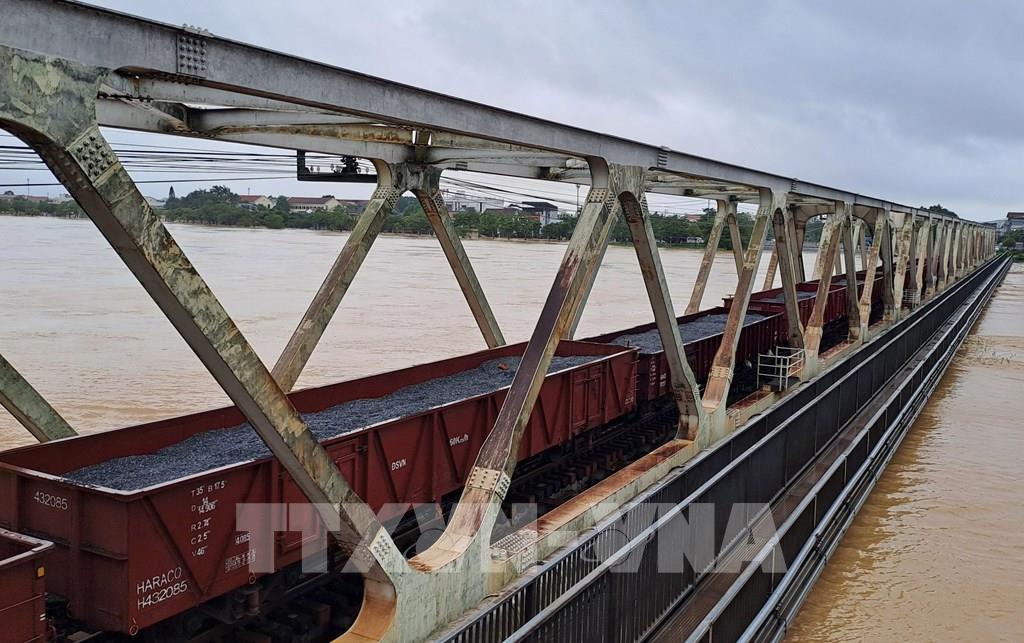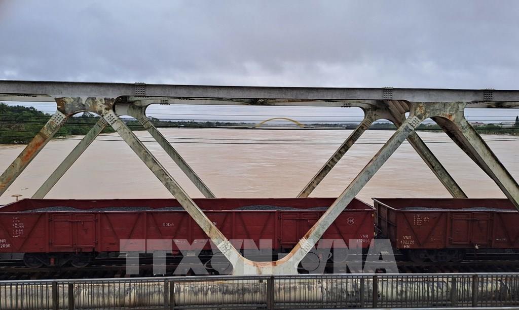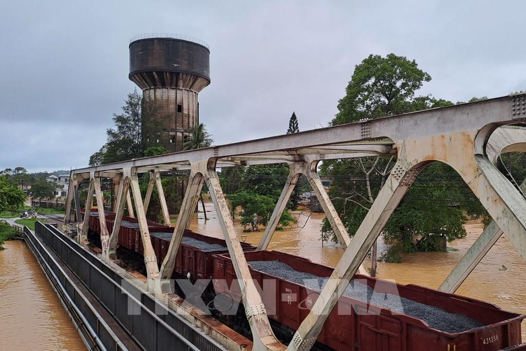 Toa xe lửa chở đá dừng trên cầu đường sắt Bạch Hổ bắc qua sông Hương, thành phố Huế để gia tải ứng phó với lũ lớn. Ảnh: Nguyên Lý-TTXVN